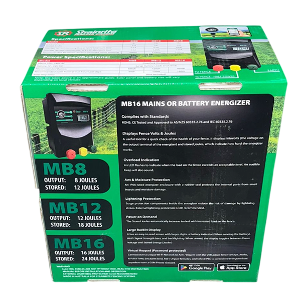 It has an easy-to-read screen with larger digits, a battery indicator (When running the battery), Wi-Fi Signal Strength bars, and backlighting. When armed, the display toggles between Fence Voltage and Stored Energy (Joules)